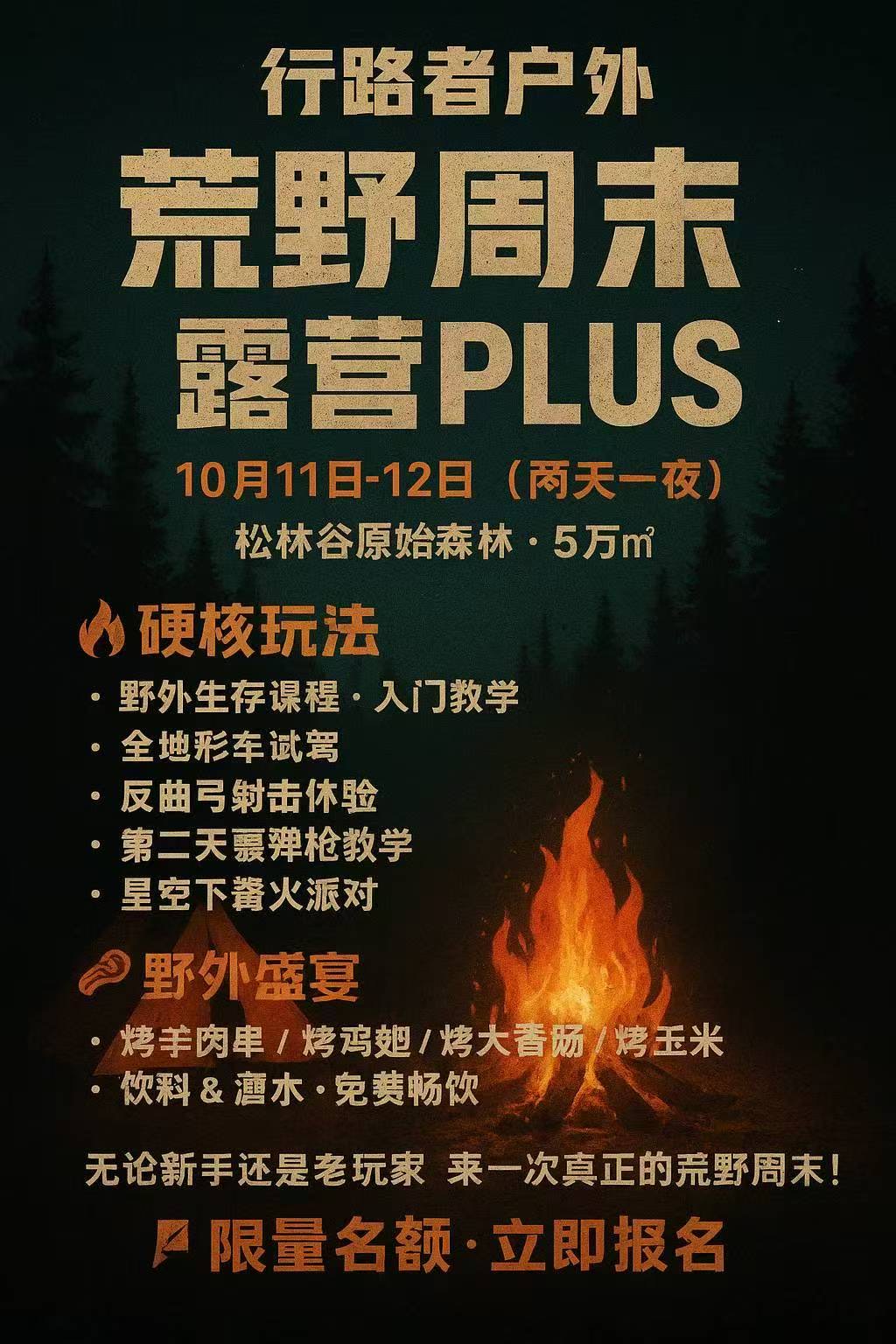 伦敦周边又有好玩儿的活动啦!和秋天最适配的户外露营体验必须体验一把!谁说露营就是风餐露宿?在松林谷,主理人直接把米其林搬进了原始森林!现切的内蒙羔羊肉,厚嫩的战斧牛排,冰镇精酿的泡沫啤酒…… 再伴着暖和又热烈的篝火,甚至还有星空下的K歌大赛和氛围一秒到位的露天影院,这是真实存在的露营体验嘛?!没错,是真的!