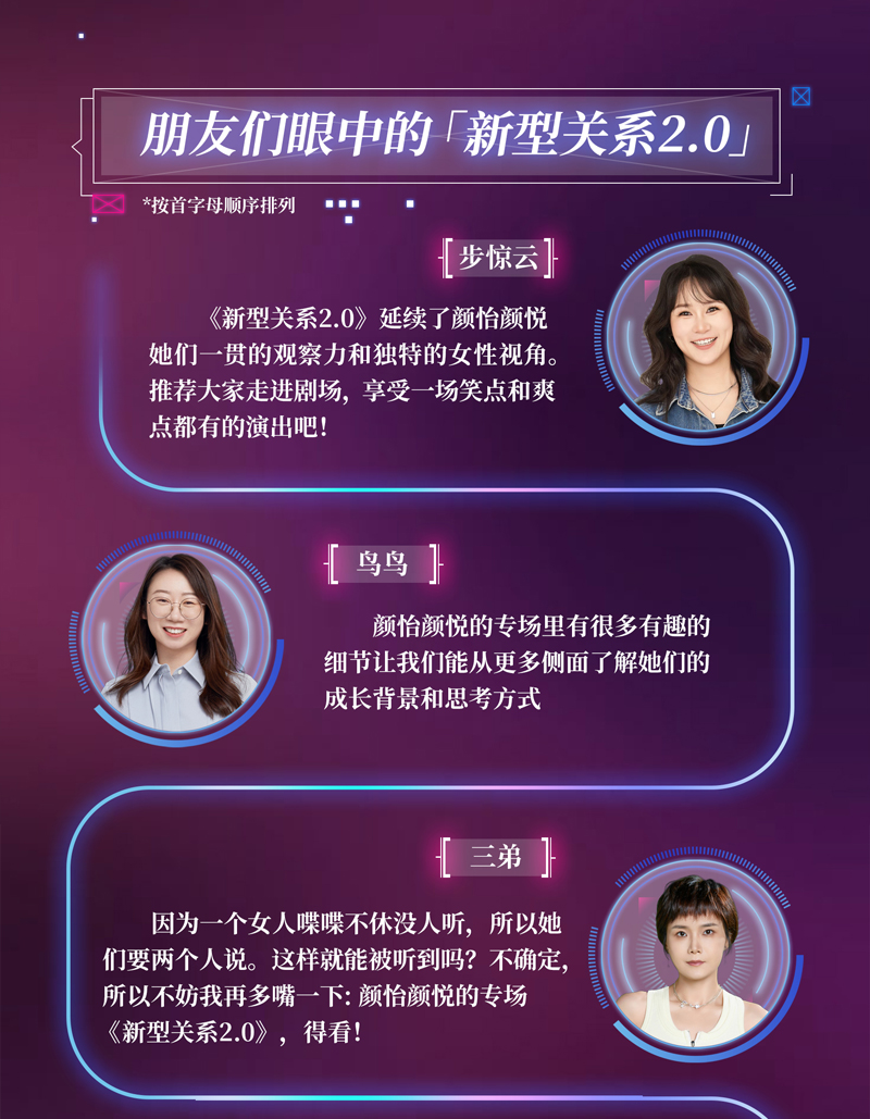 颜怡颜悦《新型关系2.0》脱口秀专场豆瓣评分高达9.4(10分满分)!好看不亏,如果说《新型关系1.0》是一起探讨女性议题和关系,那么《新型关系2.0》就是试图进一步思考新型关系的更多可能性!(大家在演出中可以多多相聚,多多夸赞,少少拉踩)