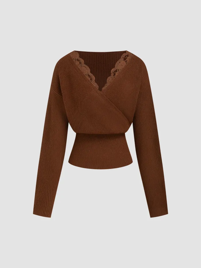 👉针织V领纯色蕾丝边长袖上衣 >> 软糯针织+精致蕾丝边!V领超显锁骨~