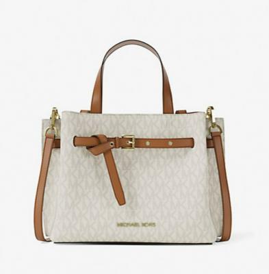 👉 Emilia 小号签名Logo手提包 >> 经典老花帆布拼接皮革,搭配醒目金色MK logo,辨识度满分