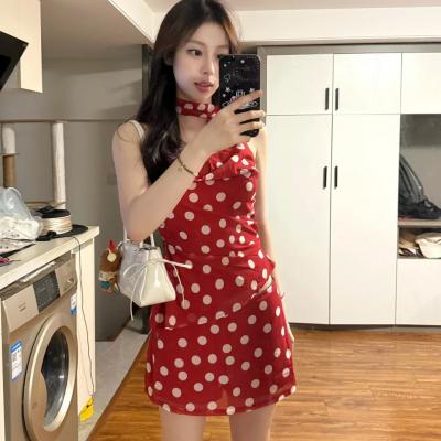 波点露背荷叶边连衣裙